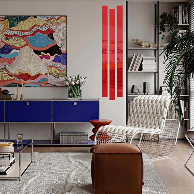 10Pcs DIY Striped Mirror Stickers 1.96" Wide Self Adhesive Removable Long Acrylic Frameless Mirror Sheets for Home Living Room Bedroom DIY Decor (Red)