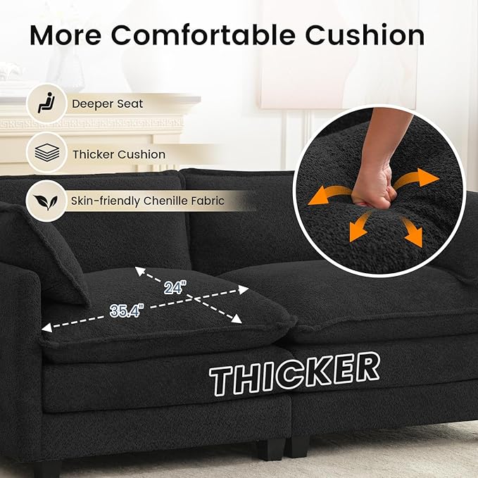 ROWHY Modular Loveseat Sectional Sofa, 78" Upholstered Loveseat, 2 Deep Seat Sofa Couch with 2 Throw Pillows for Small Space, Modern Comfy Cloud Couch for Living Room, Chenille, Black