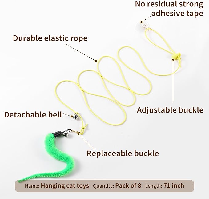 - Adjustable Height and Durable: The elastic rope of this hanging cat toy extends from 10 inches to 70.8 inches (1.8 meters) and is made of thick wear-resistant material. Even if your cat bites off the rope, you can still tie it up and extend its lifespan