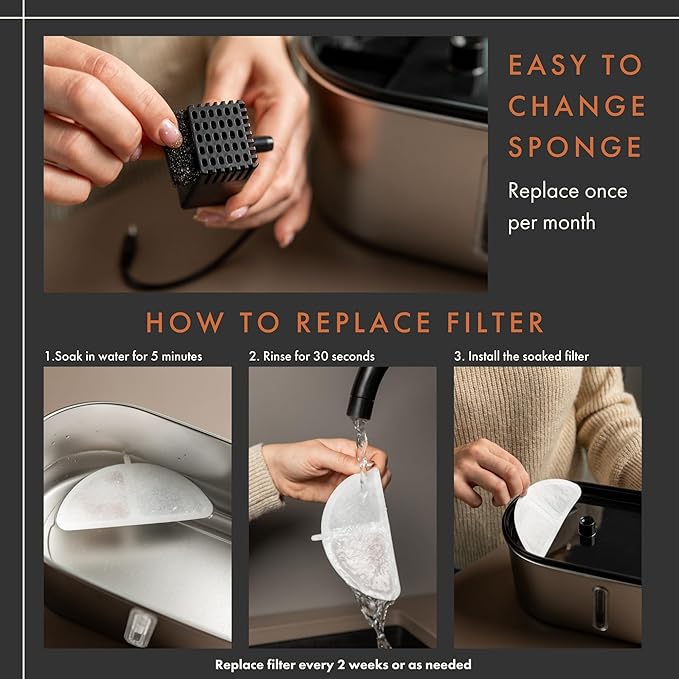 - [Easy to Install & Replace ]– Simply rinse the filter under running water for 3-5 minutes before use, then insert it into the fountain. Regular replacement ensures optimal water quality and pet hydration.