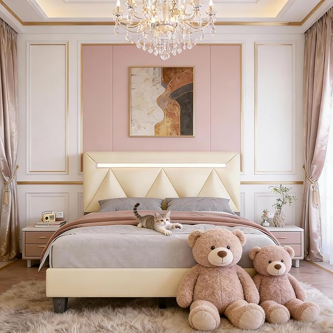Queen Size Bed Frame with Bluetooth Speaker, LED Lights and Charging Station, Faux Leather Linen Fabric Adjustable Headboard,Modern Upholstered Bed, Wood Slat Support, Easy Assemble, Beige