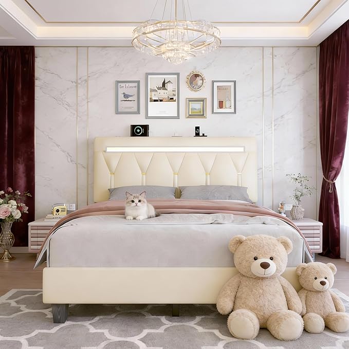 Full Size Bed Frame with Bluetooth Speaker, LED Lights and Charging Station, Faux Leather Linen Fabric Adjustable Headboard,Modern Upholstered Bed, Wood Slat Support, Easy Assemble, Beige
