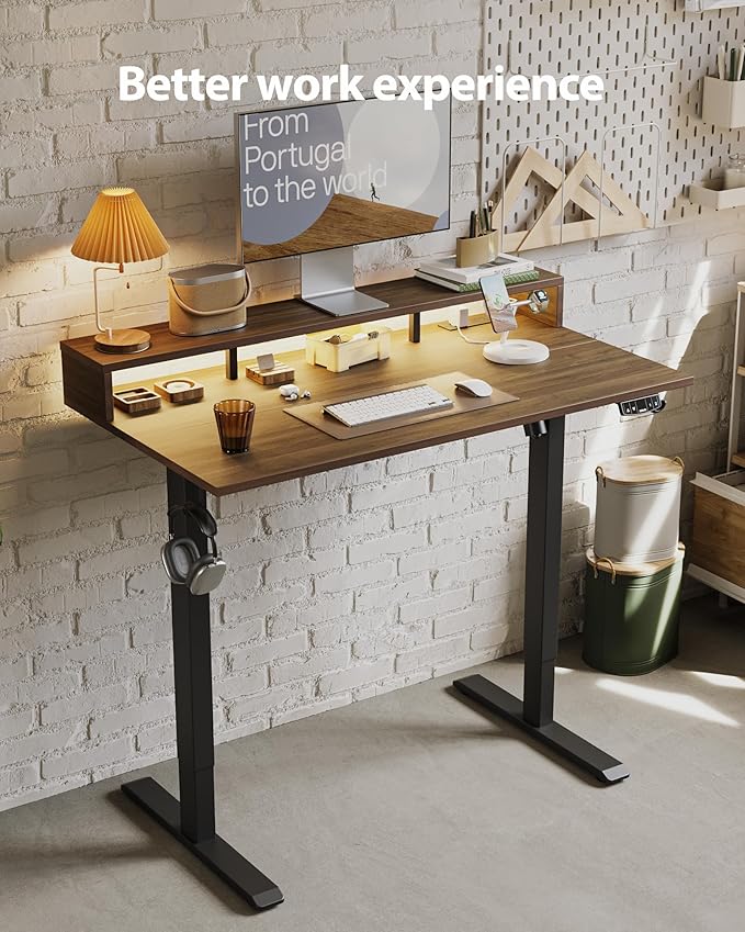 Electric Height Adjustable Standing Desk with Power Outlet and LED Light Strip, Sit to Stand, Ergonomic 48x24 Rising Desk with Memory Presets, Home Office Workstation, Computer Gaming Table, Walnut