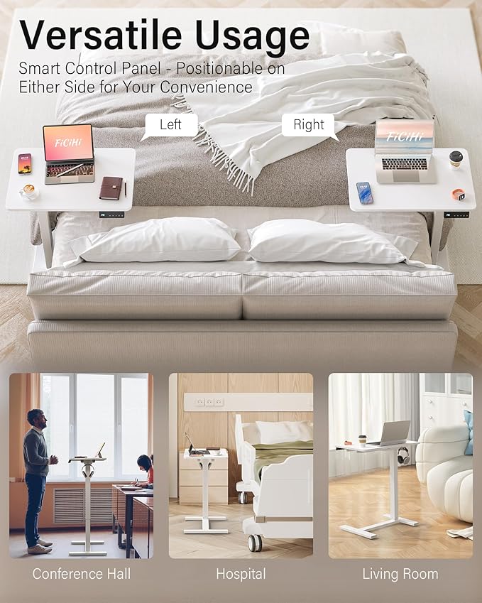 - 【Quiet & Electric Adjustable Height】FiCiHi Electric Overbed Bedside Table features a hidden brushless motor for whisper-quiet operation (<43dB). Adjust the height from 28" to 46.9" with 3 memory presets for a seamless work or relaxation experience.
