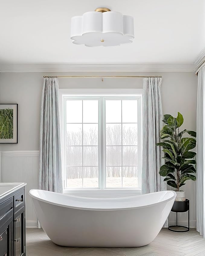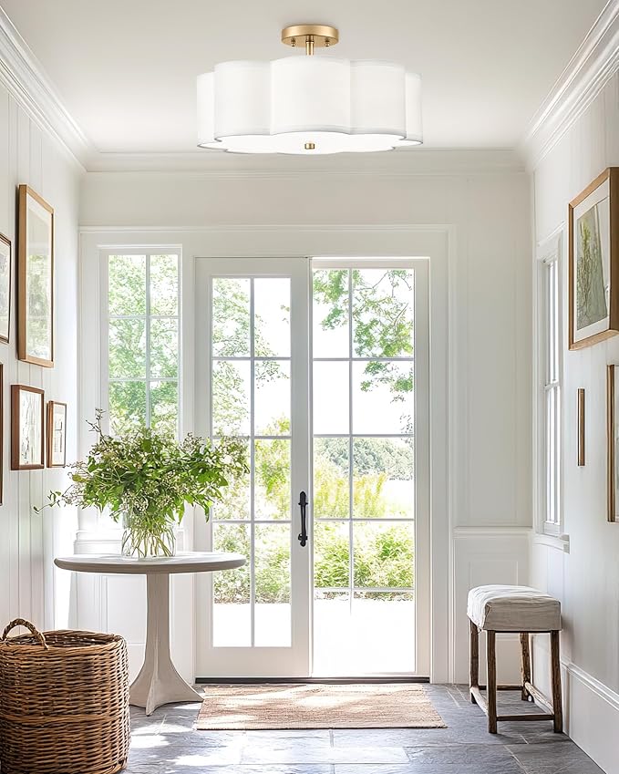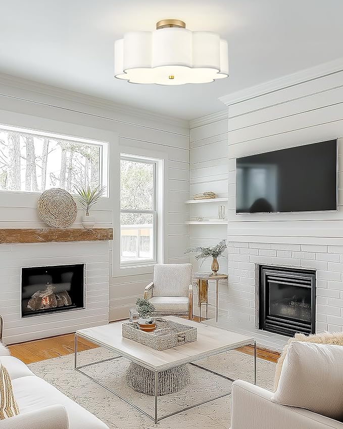 - FARMHOUSE STYLE: Elevate your space with the rustic elegance of our farmhouse semi flush mount ceiling light. Featuring a fabric shade in flower shape and brushed gold finish, it exudes a minimalist vintage vibe, adding character to any room