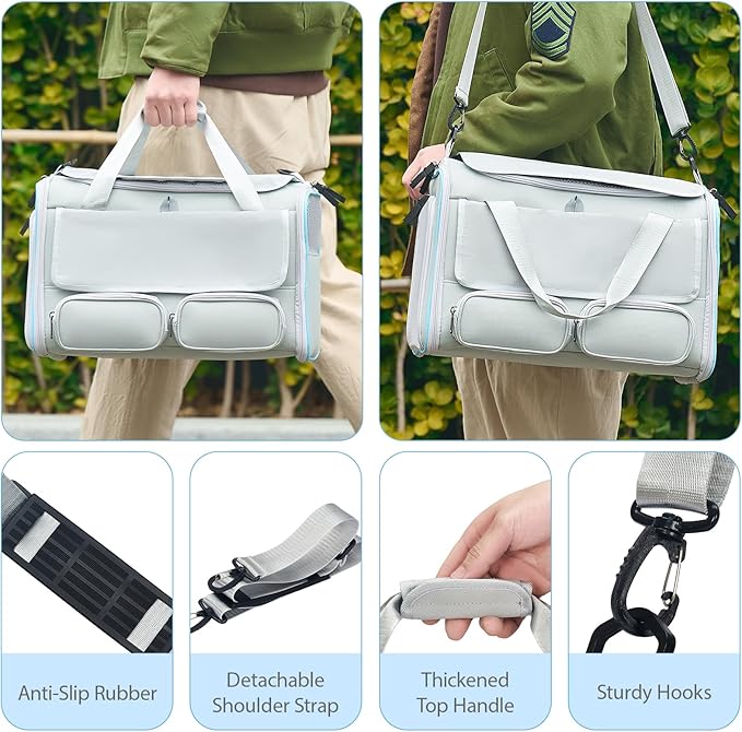 - [Portable, Foldable & Easy to Carry]: Designed for convenience, the carrier can be carried by hand, over the shoulder, or attached to luggage handles. Foldable for compact storage. Includes a removable dual-sided cushion (warm fleece for winter, breathable fabric for summer).