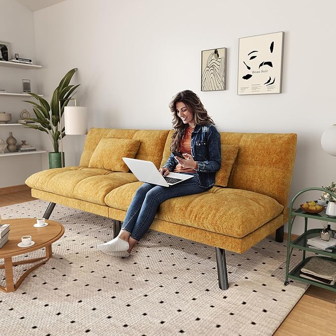 Futon Sofa Bed Convertible 70 inch Solid Wood Couch for Living Room, Chenille Fabric, 2 Cushions (Caramel Orange)