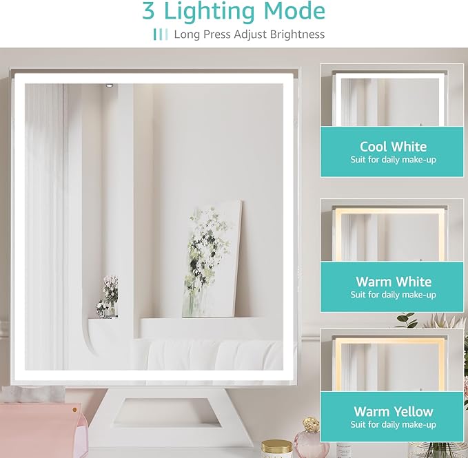 • Enhanced Lighting: LED mirror offers natural, warm, and cold light options; adjust brightness by long-pressing the screen for perfect makeup in any scene, ensuring flawless result every time