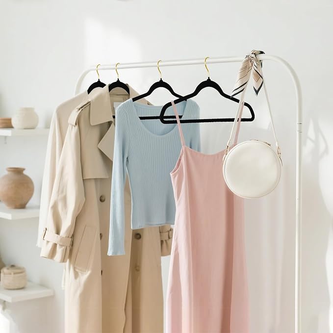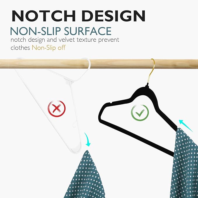 - [Hanging All Clothes]: The Premium velvet adult clothes hangers are perfect hanging your shirts, pants, jackets, dresses and more. A Golden-plated 360-degree-swivel hook on the velvet coat hangers helps you move the hangers easily when you need access to your clothes to get from hangers.