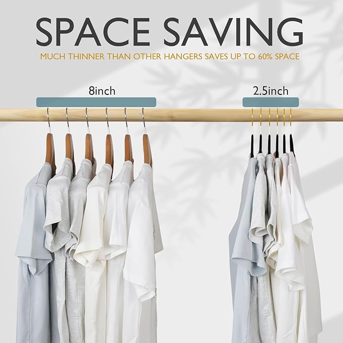 - [Velvet Texture]: Full of high quality flocked velvet on hangers holds your clothes tightly preventing the clothes from slipping. As strong as wooden suit hanger but much thinner and lighter.