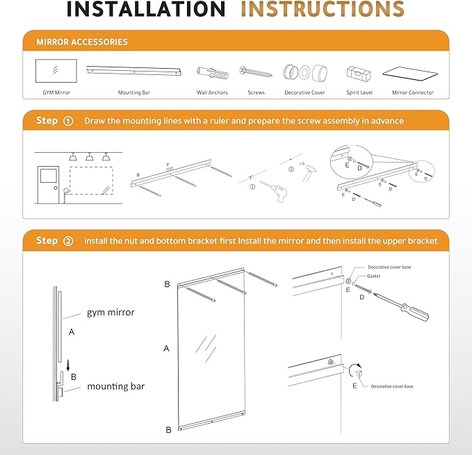 - 【Easy to Assemble, Strong Support】There are corresponding numbers in the instructions, you just need to match these numbers to complete, you can complete the installation in 20 minutes or less. Each package contains two long aluminum alloy J-bar to hold the gym mirror firmly in place, and an extra EVA buffer is added to the groove of theJ-bar to protect the edge of the mirror and prevent it from slipping.