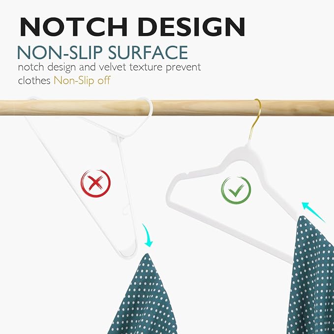 - [Hanging All Clothes]: The Premium velvet adult clothes hangers are perfect hanging your shirts, pants, jackets, dresses and more. A Golden-plated 360-degree-swivel hook on the velvet coat hangers helps you move the hangers easily when you need access to your clothes to get from hangers.
