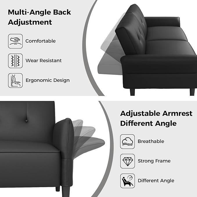 - 【Four-position Adjustable Armrests】Designed in popular styles, this convertible sofa bed is a perfect blend of style and durability. The armrests on both sides can be deployed outward for maximum side lying area, and the maximum deployment angle can be up to 90°. Meanwhile, with the two soft report pillows provided, you can place the pillows at the cervical vertebrae and lumbar region to effectively relieve fatigue