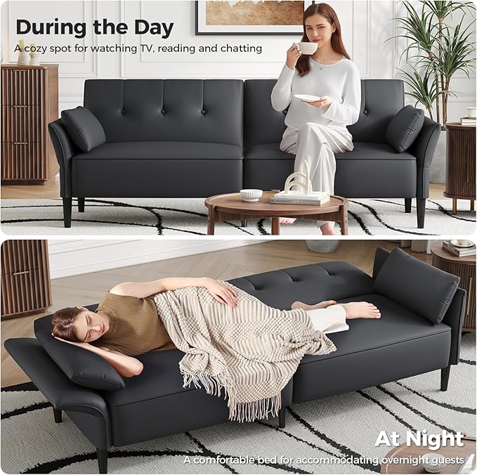 - 【Ideal Convertible Sofa】COPIAE’s futon sofa bed has a spacious dimension, which is enough to comfortably seat 2-3 people. Meanwhile, this is a versatile functionality sofa that has three adjustable split folding backrest settings available, can be switched between sofa, bed and recliner, the bed form size can be reached 89”L*42.1”W*16.9”H, suitable for living and guest rooms