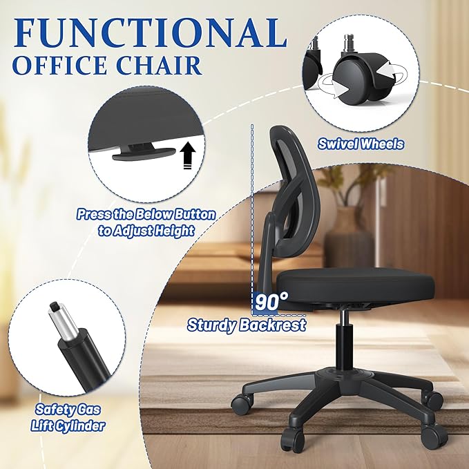 - Functional Office Chair No Arms: Our desk chair comes with a safe gas cylinder for flexible height adjustment. 360 rotating wheel and seat can also ensure flexibility in use