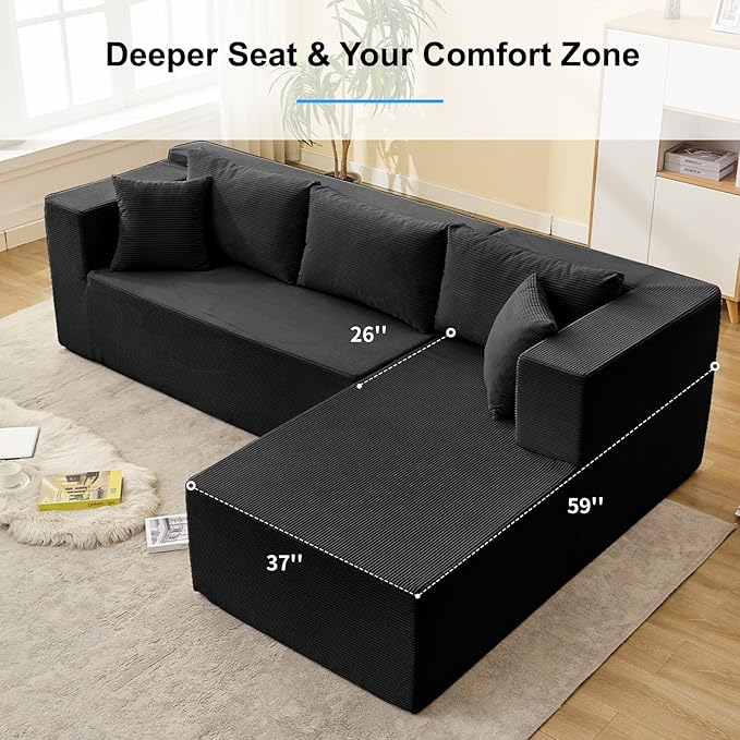 PUREMIND 106" Black Sectional Couches for Living Room, Cloud Couch Modular Sectional Sofa, Corduroy L Shape Sofa with Deep Seat, Modular Boneless Foam Couch Corner Couches No Assembly Required
