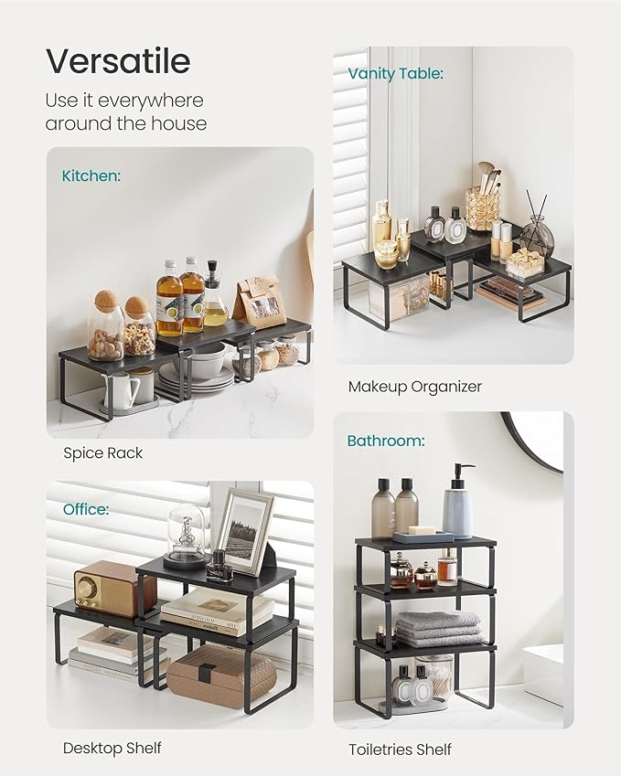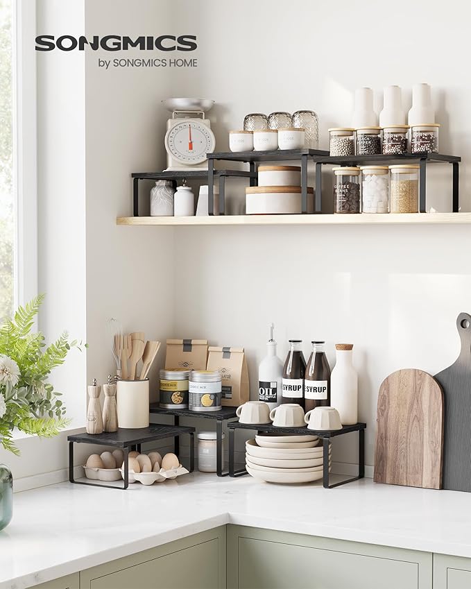 SONGMICS Cabinet Organizer Shelf, Set of 3 Kitchen Counter Shelves, Kitchen Storage, Spice Rack, Stackable, Expandable, Anthracite Gray and Matte Black UKCS220B01