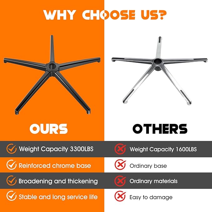 - 【Ensure Safe Chair Base】This 26-inch diameter office chair base is wider than the average office chair. Low center of gravity design with base height of 4 inches. The material is thick at 6.2 pounds and has better load-bearing capacity. All three ensure stability and safety while sitting on the chair. Don't worry about weight 500 pounds or more