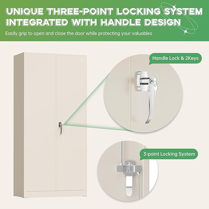 - 【High Security Locking System】 locking cabinet adopts an upgraded version of the 3-point lock system.It can provide higher security for your valuables and important items. lockable storage cabinet also includes 2 spare keys.