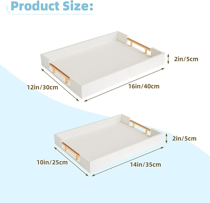 - Perfect Size for Coffee Tables: These trays are the perfect size for coffee tables or ottomans(16"x12"x1.8" and 14"x10"x1.8"), offering a stylish way to organize and display items. Whether you need a tray for ottoman use or a coffee table tray, this set has you covered