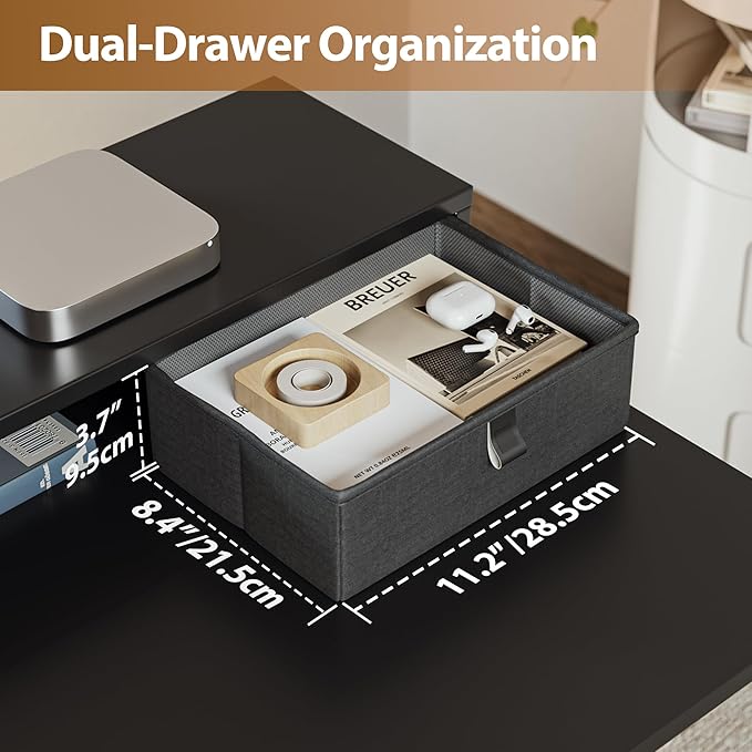 - 【Tidy & Functional】Includes fabric drawer, 2 cable grommets, and dual hooks. Low-VOC desktop meets indoor air safety standards.