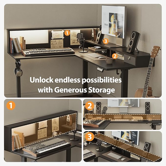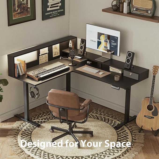 - 【L-Shaped with Hutch】Space-saving L-shaped design with elevated shelf for monitors, books, or décor. Fits snugly in corners.