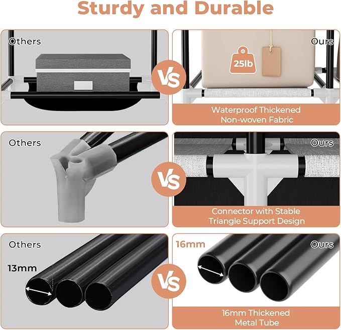 - [Sturdy and Durable Construction] Closet storage organizer is made of thickened metal tube, waterproof non-woven cover and reinforced PP plastic connectors. Provides superb weight capacity, sturdy, and durable. Meet your long-term storage needs.