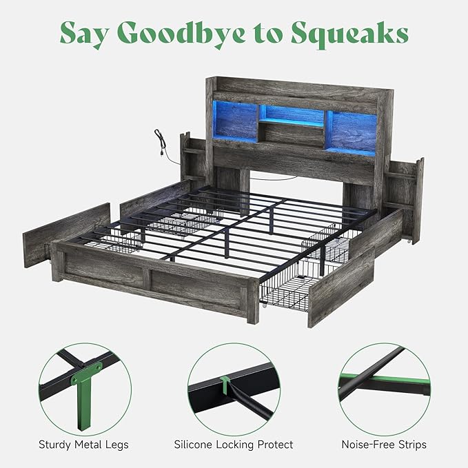 - Unique headboard side drawer: Bedframe features 4 under-bed drawers, bookcase headboard with 4 open storage spaces & 2 slide 3-tier side shelves that can be used as nightstands. This bed with storage can meet your different storage needs.