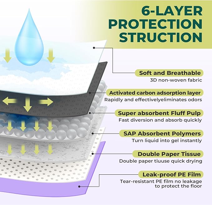 - Super Absorbent & Leak-Proof Design: Our cat pads feature a 6-layer construction with a super absorbent SAP core that absorbs up to 15 cups of urine. Each pad can last for 2-3 days for two cats, keeping your litter box dry and clean. The leak-proof bottom, made from durable PE film, ensures no spills or tears, preventing liquid from seeping out and keeping your home fresh