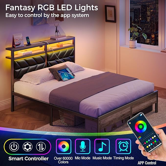 Seventable Bed Frame Queen Size with Charging Station, LED Bed with Upholstered Storage Headboard, Metal Platform Bed with Under Bed Storage, No Box Spring Needed, Noise Free, Easy Assembly, Black