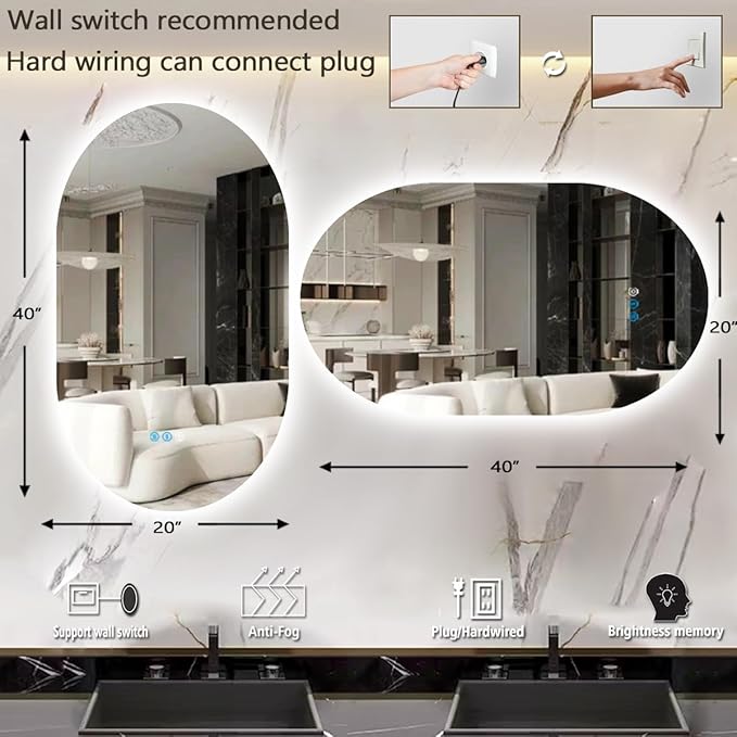- đ„°ăPersonalized Install - Horizontal or Vertical and Plug or HardwiredăEach mirror comes with a standard plug that can be plugged into a standard outlet convenience. Or you can cut the plug, connecting to your switch. Compliance with safety standard and energy saving. You can choose to hang it horizontally or vertically according to your needs.Coming with accessories to hanging the mirror, just reading the instruction carefully. Easy and safe to install.