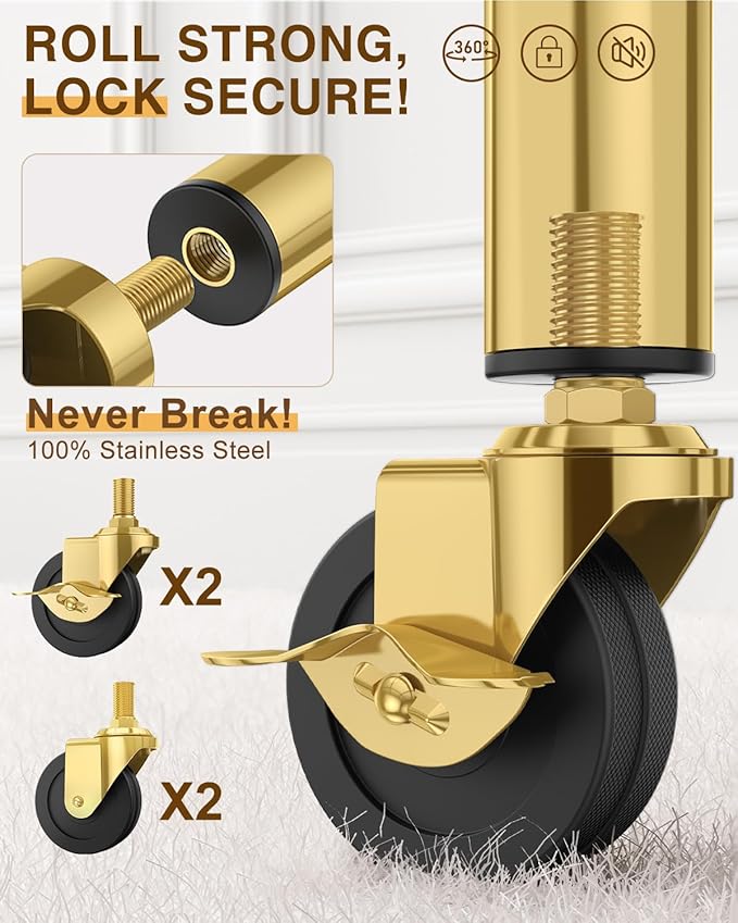 - SILENT ROLLING & LOCKABLE WHEELS! Our design makes moving your clothing rack an absolute breeze. The 360° swivel wheels allow for effortless transport with just a gentle push, so you can reposition your rack to any spot without a struggle. 2 of the 4 heavy-duty wheels are lockable, providing stability and ensuring that your rack stays securely in place. These wheels are crafted to be both quiet and floor-friendly, so you won't have to worry about noise or scratches as you move your rack around.