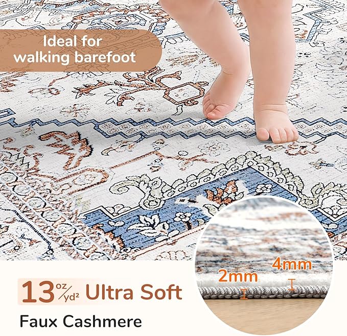 OPPODREAM Thin Round Rug 4ft, Neutral Washable Circle Rug 4ft with Non Slip Backing Play Room, Low-Pile Carpet 4 ft, Small Faux Cashmere Throw Carpet, Cream White & Blue & Light Brown