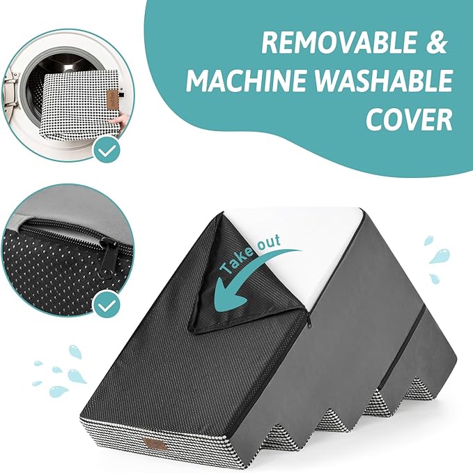 - Non-Slip Base and Removable Cover: Our dog steps for beds are equipped with a non-slip base featuring rubber dots for extra grip, minimizing movement during use. The pet steps cover is waterproof on the inner side, so you donโt have to worry about stains seeping into the foam. The outer cover is removable and machine washable for easy cleaning