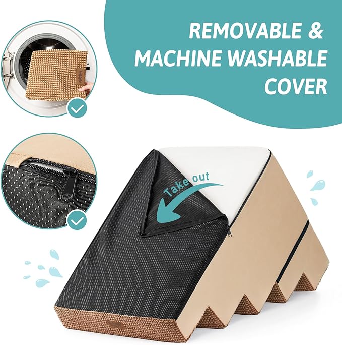 - Non-Slip Base and Removable Cover: Our dog steps for beds are equipped with a non-slip base featuring rubber dots for extra grip, minimizing movement during use. The pet steps cover is waterproof on the inner side, so you donโt have to worry about stains seeping into the foam. The outer cover is removable and machine washable for easy cleaning