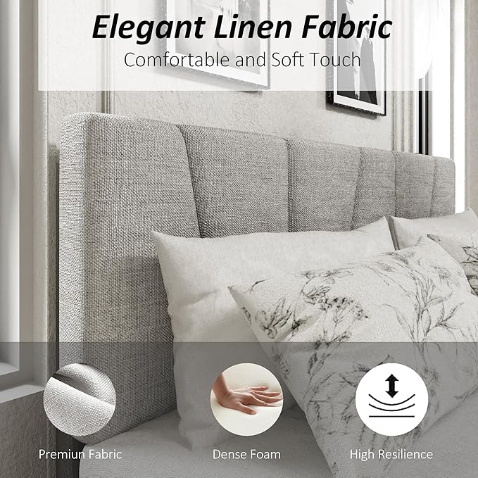 Full Size Platform Bed Frame with Upholstered Headboard, Wooden Slats Support, Noise Free, No Box Spring Needed, Easy Assembly, Light Grey, Linen