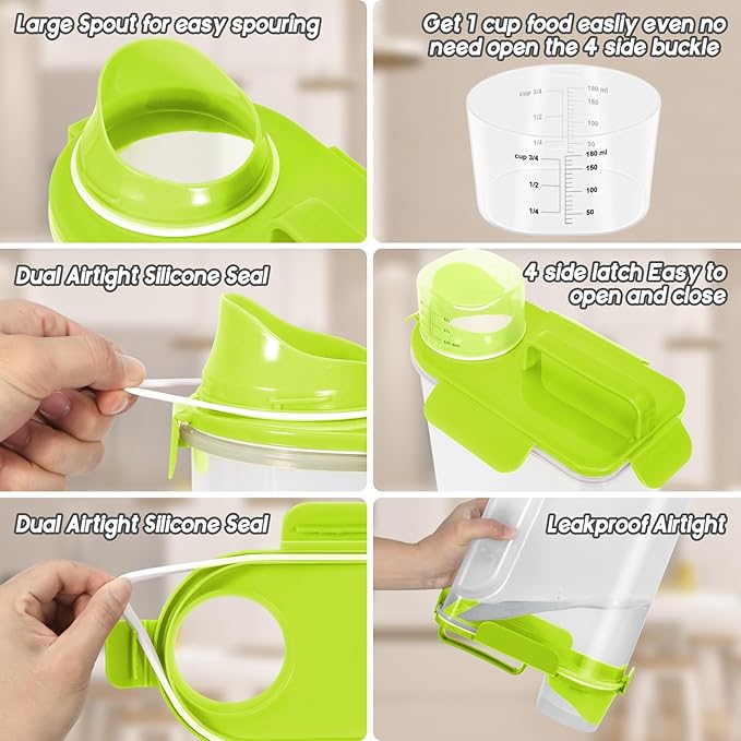 5-7Lbs Cat Dog Storage Container, Portable Pet Food Containers with Upgraded Large Spout and Cup, Small Animal Kibble Dispenser for Bird Seed, Oatmeal, Rice, Flour (1, Bright Green, 5L)
