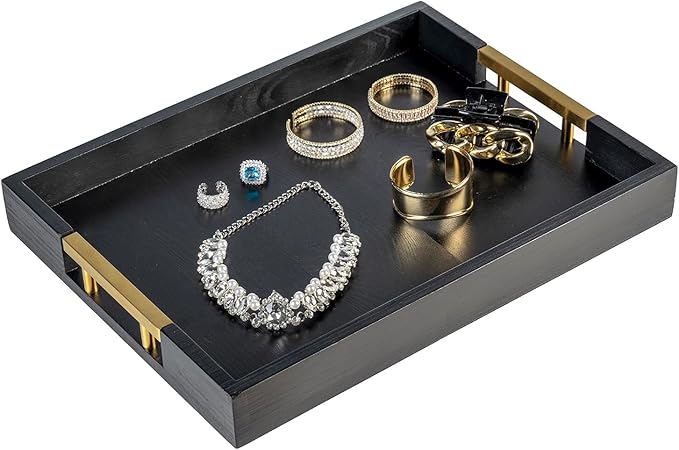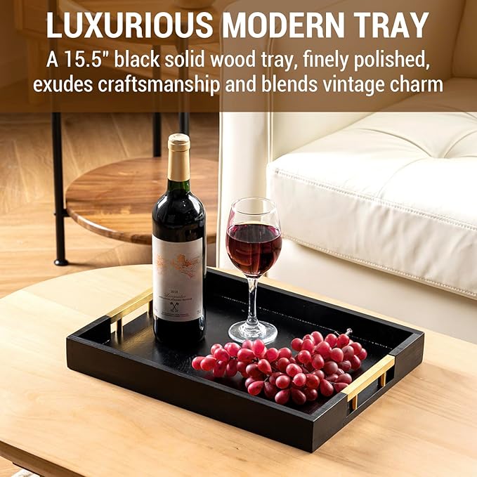 - 15.5-inch vintage black wooden tray with gold-toned metal handles, perfect for serving food, drinks, or displaying decorative items with a luxury designer aesthetic