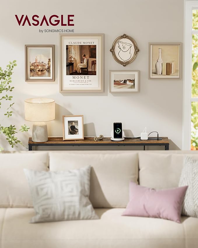 VASAGLE Console Table with Power Outlet, Slim Behind Couch Sofa Table, 5.9 x 39.4 x 31.5 Inches, 1 Hook, Easy Assembly, for Entryway, Living Room, Rustic Brown and Ink Black ULNT079K01