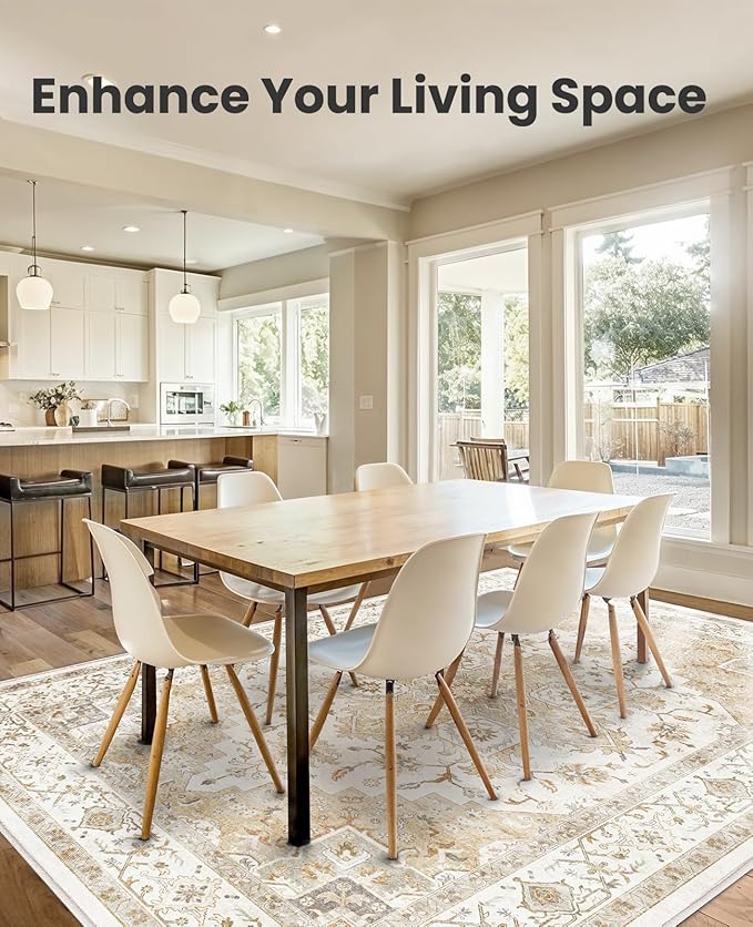 - Machine Washable: The short pile design of this washable rug is easy to maintain using an upright vacuum or robotic vacuum cleaner. The dining room rug is also machine-washable for fast and hassle-free cleaning. After washing, a low-temperature iron can help to keep the large area rug’s surface flat and smooth.