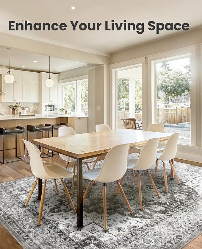 - Machine Washable: The short pile design of this washable rug is easy to maintain using an upright vacuum or robotic vacuum cleaner. The dining room rug is also machine-washable for fast and hassle-free cleaning. After washing, a low-temperature iron can help to keep the large area rug’s surface flat and smooth.