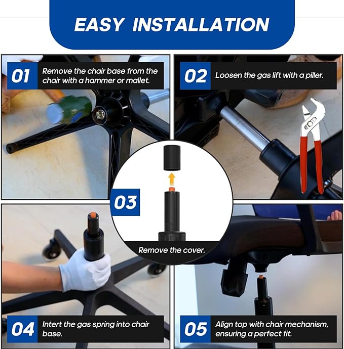 - Easy Installation:Usually you may need to use a rubber mallet to take out the old gas lift cylinder from chair base and can be installed easily without additional screws required.Spending 5 minutes will bring a new life to your old office chair.