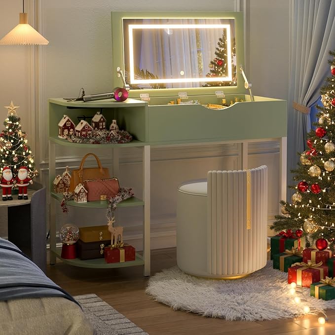 Cyclysio Vanity Desk with Flip Top Mirror and Lights, Makeup Vanity Desk with Drawers, Dressing Table with Storage Shelves & Charging Station, Small Vanity for Small Spaces, Green