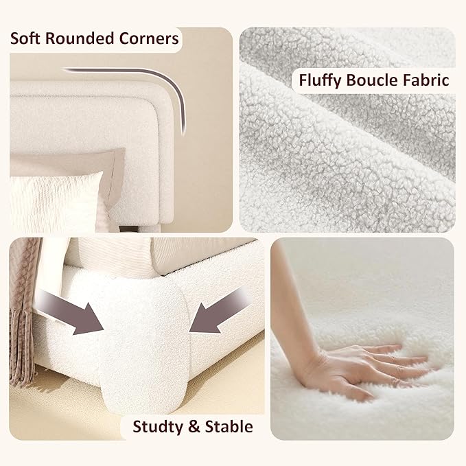 Queen Boucle Platform Bed Frame with Height Adjustable Headboard, Modern Upholstered Cloud Bed, Sleek Curved Design, No Box Spring Needed, Easy Assembly, Noise Free, White