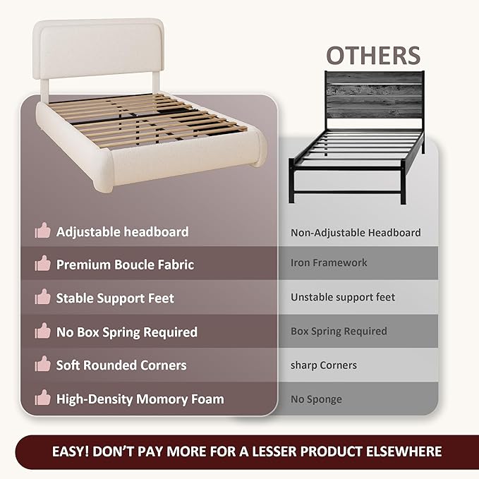 King Boucle Platform Bed Frame with Height Adjustable Headboard, Modern Upholstered Cloud Bed, Sleek Curved Design, No Box Spring Needed, Easy Assembly, Noise Free, White