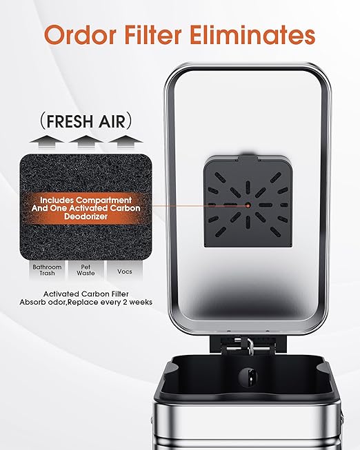 - Odor-Free: The Odor Control trash can included compartment and activated carbon deodorizer absorbs waste odors, 360Β° sealed space prevents odors from escaping from the can, making your space cleaner