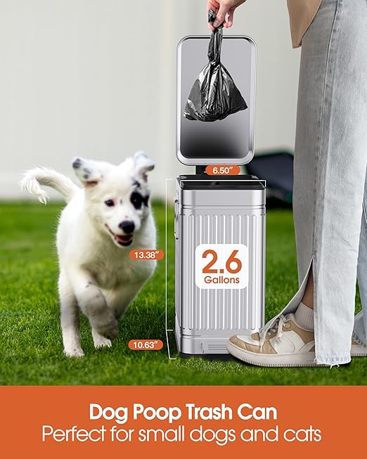 Small Trash Can with Lid Soft Close-10L/2.6 Gal Stainless Steel Outdoor Dog Poop Garbage Can-Metal Waste Bins with Pedal for Bathroom Bedroom Office-Silver