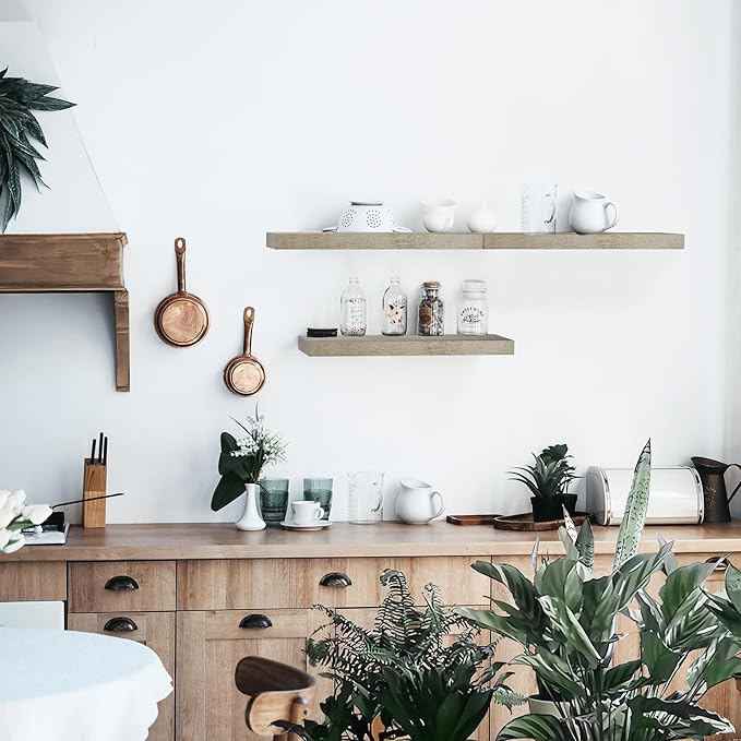 - STRONG AND DURABLE: Crafted from high-quality materials, these kitchen wall shelves are 1.5 inches thick and 9.25 inches wide, capable of holding up to 50 pounds. Solid brackets ensure no sagging or wobbling, providing reliable support for your favorite items.