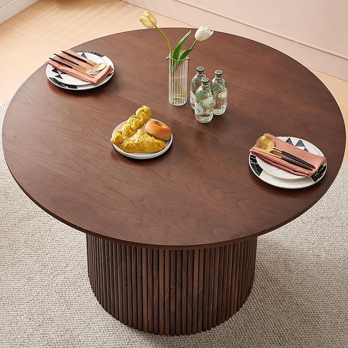 47" Round Dining Table for 4, Modern Farmhouse Wood Veneer Top with MDF Striped Base, Kitchen & Dining Room Tables - Walnut Color