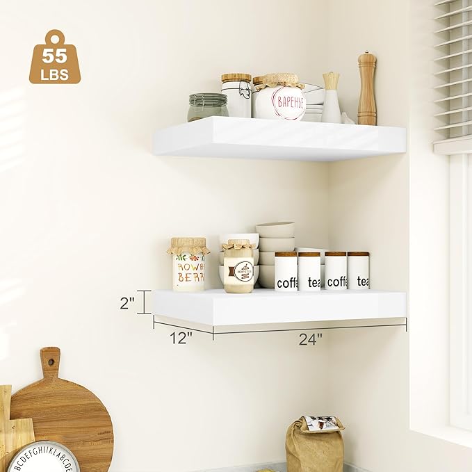 - 12 Inches Deep Floating Shelves :This extra deeper and thicker wall shelves are 24"L x 12"D x 2" H,with a capacity of 55Lbs. Our shelves for wall decor create a variety of storage spaces to organize small items on your desktop or counter.and they blend seamlessly with the rest of other decor and provide a stylish way to organize and display items.